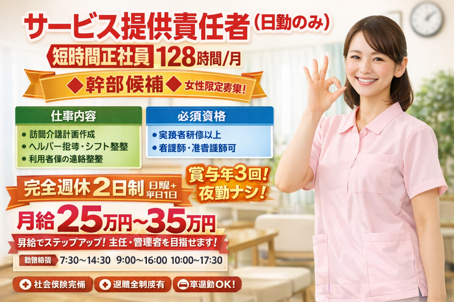 早上がりシフトや、遅番シフトが組まれている場合に、新規にご利用者様のサービスが始まったり、ヘルパーさんの急な欠勤などの場合に、実働週25時間以内での追加シフト、場合によっては残業の可能性はあります。