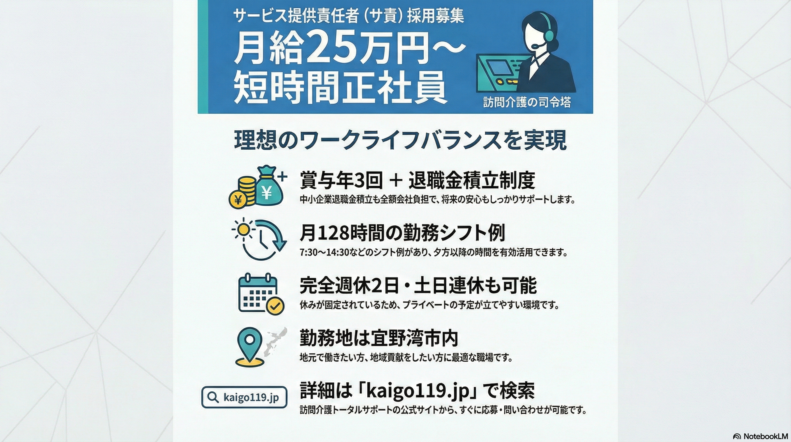 | アクセス | 宜野湾市役所より徒歩3分・すこやか薬局、宮城医院と同じ建物の2階です。 ※面接の方へ 敷地内駐車場はお客様駐車場のみとなっています。面接の際は近隣駐車場をご利用ください。 |